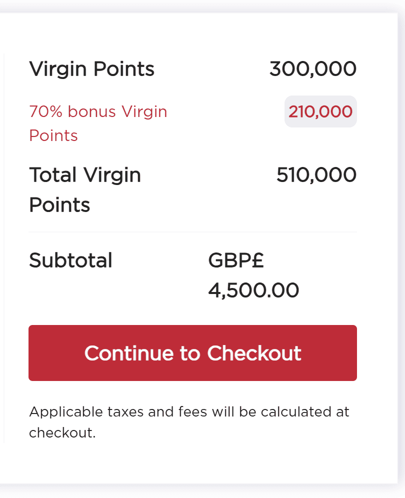 Buy Virgin Points with a 70% bonus points offer, which is decent. However, ensure you have a firm plan and are ready to bear the substantial Carrier-Imposed charges on Virgin Atlantic flights. If you plan to use it for SkyTeam or other partner airlines, check your flight costs with reward seat availability and cost.