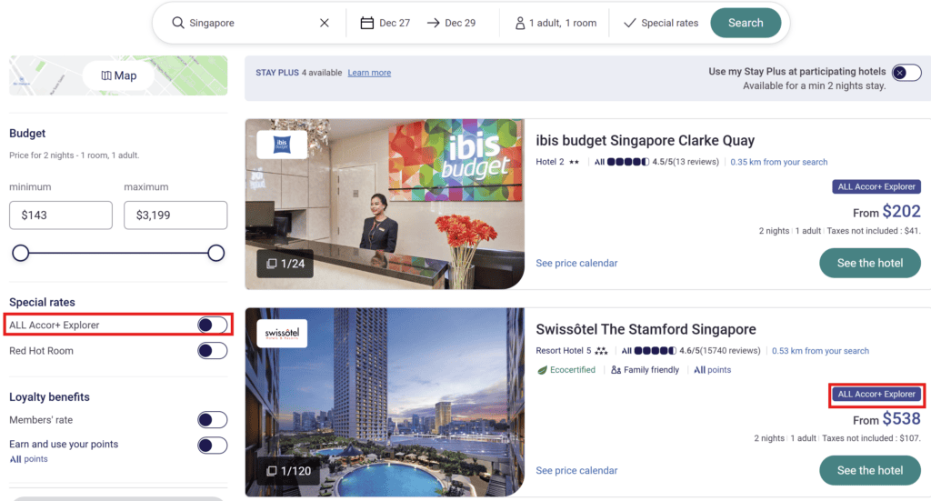 If you are an Accor+ explorer member, you will see the discounted rate for your stay. You can also filter hotels that are offering ALL Accor+ Explorer rates. You also earn Accor points for stays booked with Accor+ explorer rates and can redeem them, too.