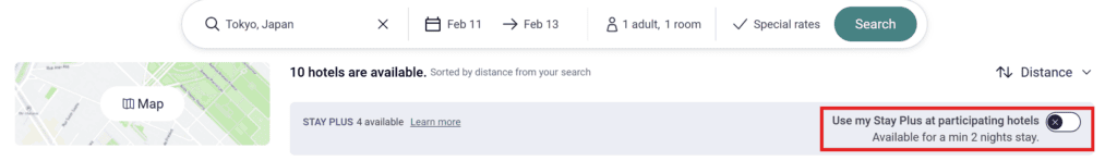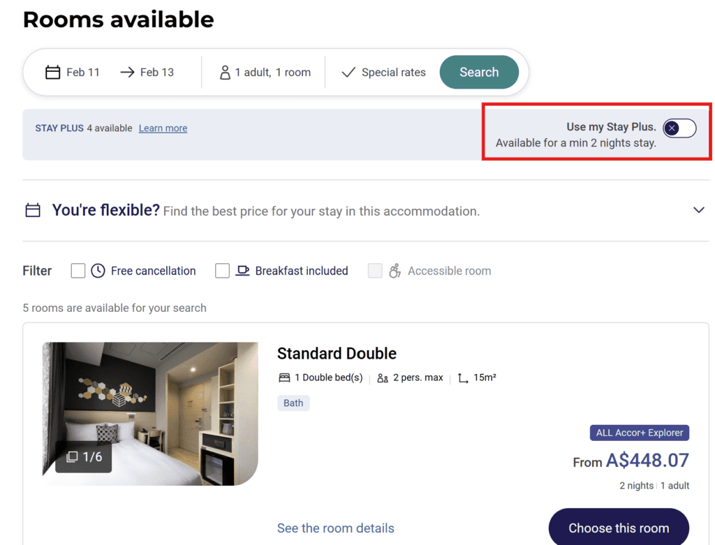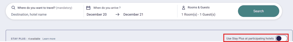 Stay Plus is very easy to use. If you are an Accor+ Explorer member, you can use the option of “Use Stay Plus at participating hotels” when searching for available hotels on your dates.